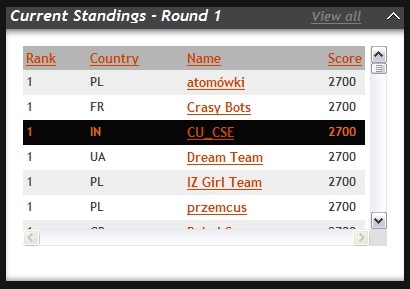 Our team CU_CSE is right at top with 8 other teams. Till now around 150 teams have taken part. I hope that 2700 is the maximum that we one can score in this round ... but let's see if somebody can beat that.